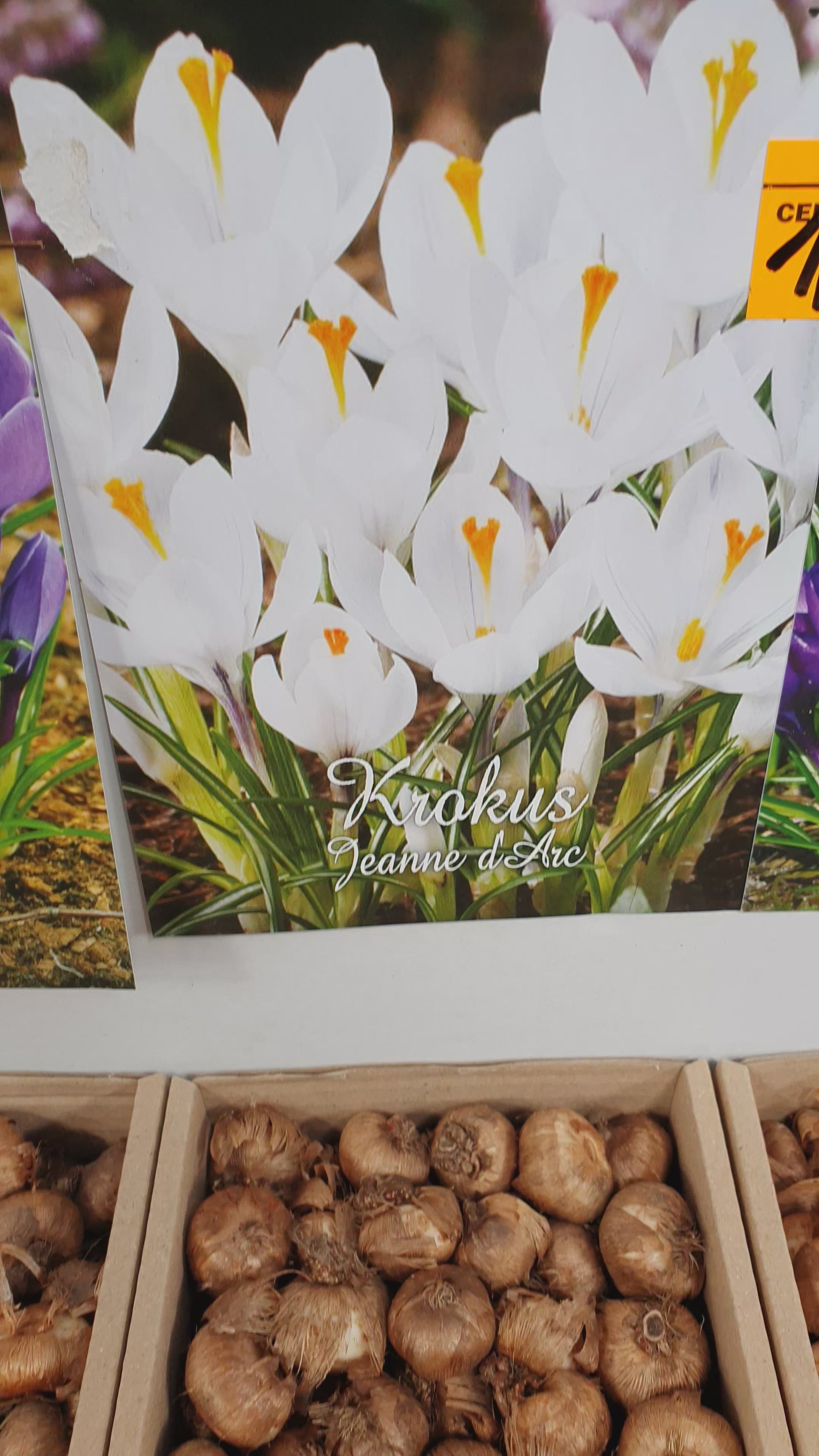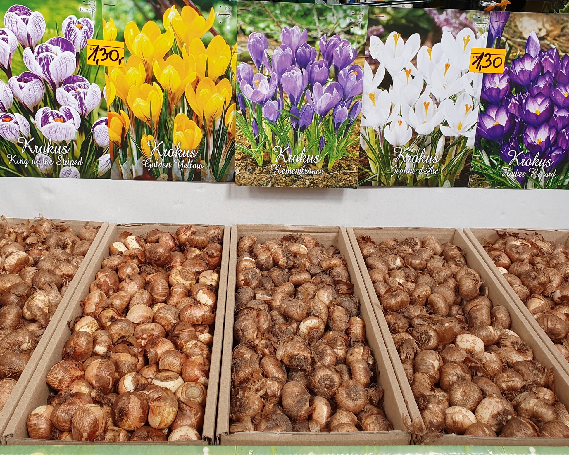Cebulka krokusa wielkokwiatowego w różnych odmianach (od lewej):